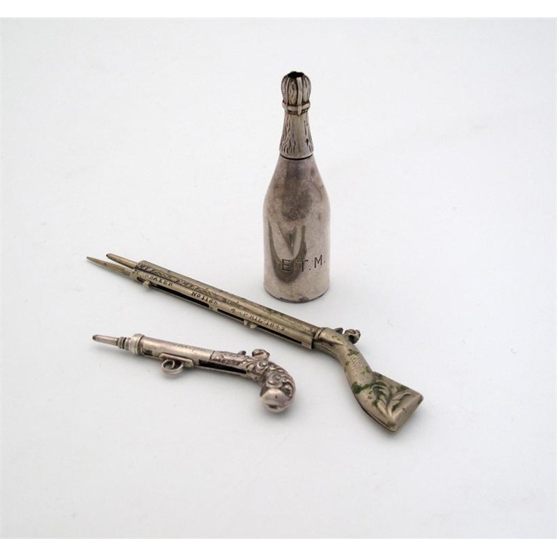 modelled as a pistol, foliate scroll handle, plus an electroplated novelty slide action pencil/ tooth pick, by J. Barker, 1842, modelled as a musket, plus a silver propelling pencil modelled as a champagne bottle, Birmingham 1914. (3)