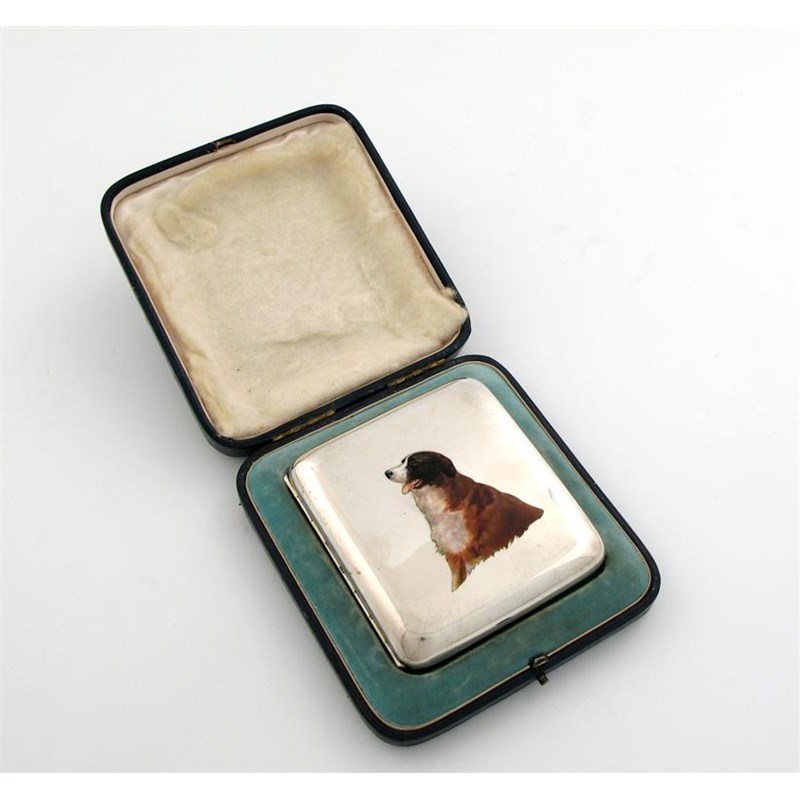 rectangular form, the hinged cover enamelled with a dog's torso, the reverse engraved with the initials and crest of Arundell Neare, gilded interior inscribed 'presented to Arundell Neare by the household of Llysdulas and wellwishers July 2nd 1896', length 9.2cm, in the original fitted case.
