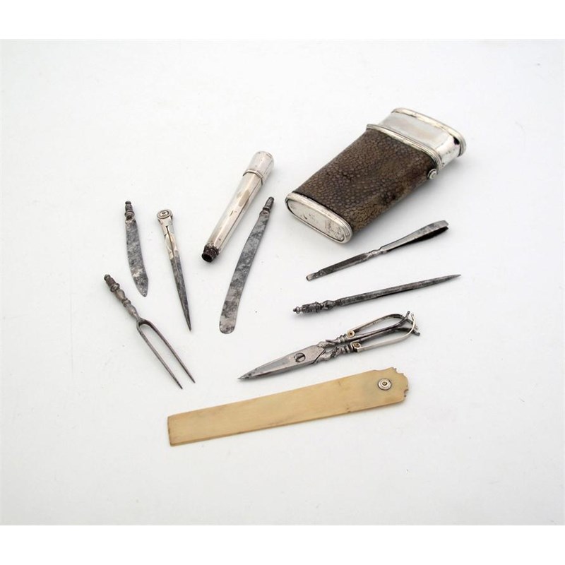tapering compressed oval form, the based covered in shagreen, the interior with two silver handles, two knife blades, a fork, a bodkin, a nail file/tweezer, a pair of scissors, a pair of dividers, and an ivory ruler, length 9.3cm.