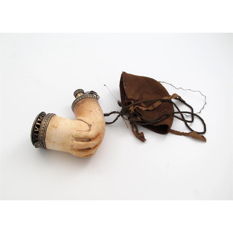 the silver gilt mounts with chased foliate decoration, hinged cover, pierced 'IN FUMO VIVIMUS', the bowl carved with a hand, length 14cm.