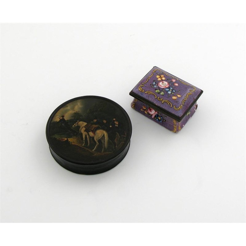 circular form, the cover with the scene of a military convoy with a horse, diameter 7.2cm, plus an enamelled box, of rectangular form, hinged cover, decorated with flowers on a purple ground. (2)