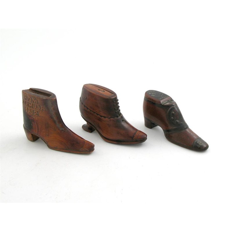 the hinged cover with inlaid decoration, dated 1866, plus two further shoe snuff boxes. (3)
