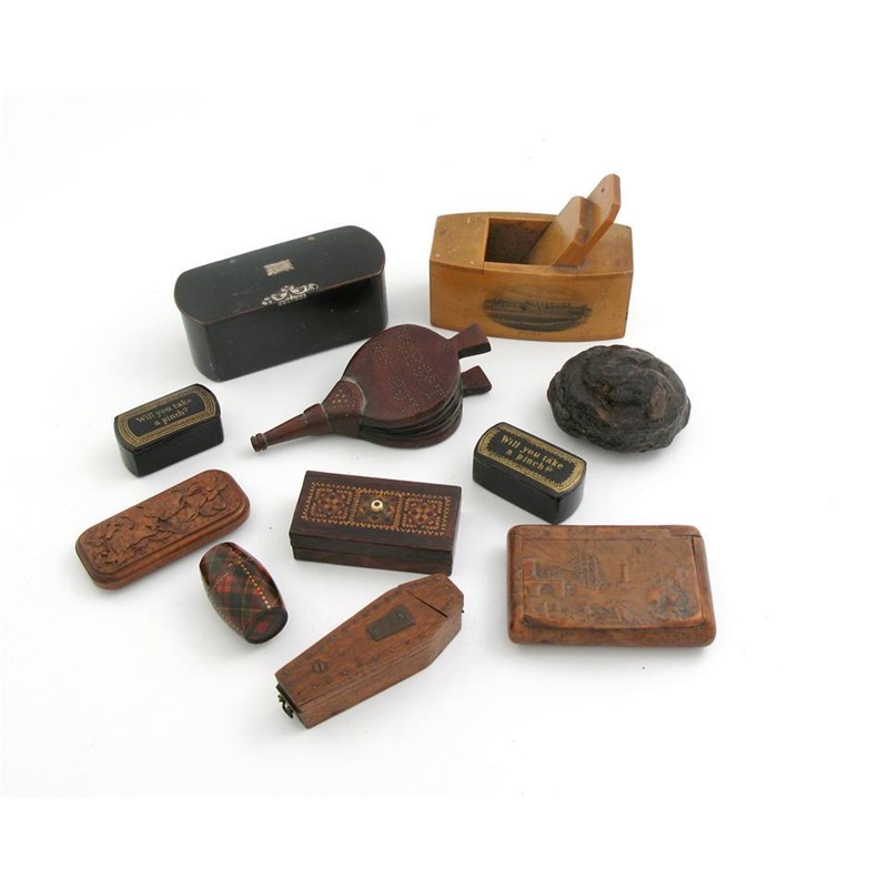 comprising a snuff box modelled as a pair of bellows, inlaid 'Forget Me Not', a Mauchline ware woodworking plane from Chester, a Tartan ware barrel thimble case, plus a coffin snuff box, and seven various snuff boxes. (qty)