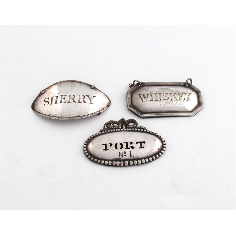 oval form, incised 'SHERRY', length 5.2cm, plus two electroplated wine labels. (3)