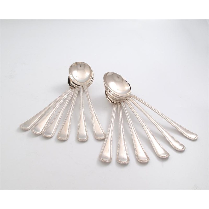 A set of twelve silver Edwardian silver Bright-cut soup spoons,