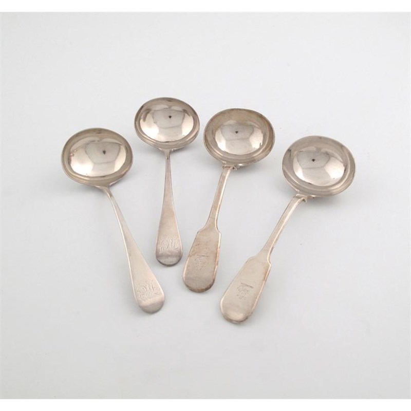 the terminals initialled, plus a pair of Victorian silver Fiddle pattern sauce ladles, London 1863, approx. weight 8oz. (4)