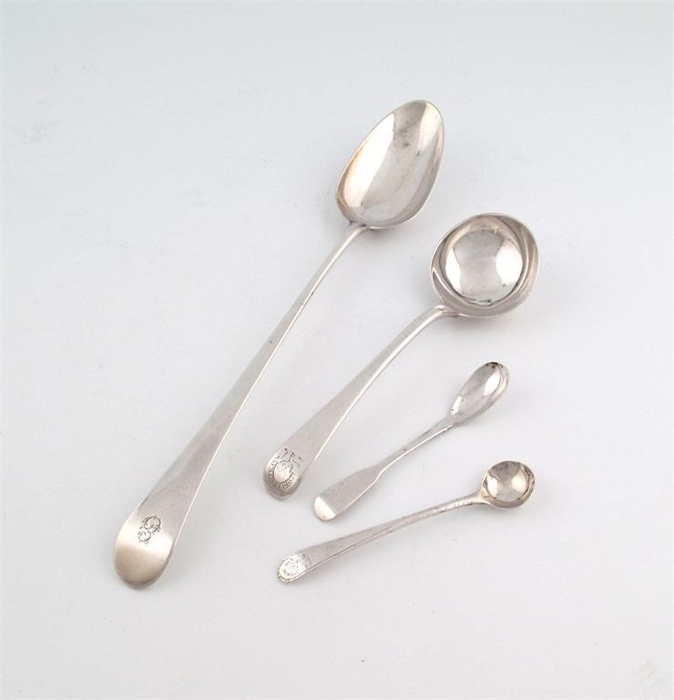 the terminal engraved with an initial, a George III sauce ladle, London 1781, plus an Irish mustard spoon and a Scottish salt spoon, approx. weight 5oz. (4)