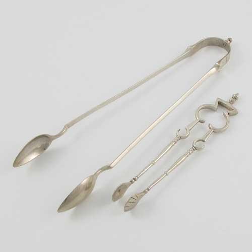 A pair of George III elongated, slender 'embertong' design sugar tongs, engraved and double ball finial, unmarked, and a pair of andiron type sugar tongs, makers mark possibly 18th century, 1.5oz.