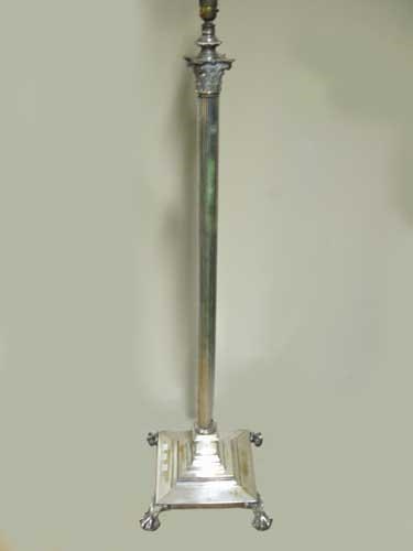 A late Victorian electroplated standard lamp, with bevelled square base, ball and claw feet and a corinthain column, 49.5in (126cm) high.