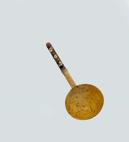 A late 19th/early 20th century Russian mounted birchwood caviar serving ladle, with a cloisonne enamelled handle, with a coral terminal, makers mark '?X'. with state marks for 1896-1908, 6.4in (16.1cm) long.