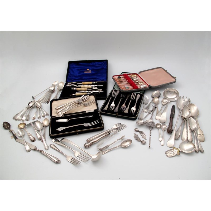 comprising silver items, a Scottish toddy ladle, a modern spoon, two sets of six teaspoons, a cased fork and spoon set, a dessert spoon, fourteen other items, a set of six cake forks, six metalware coffee spoons with hard stone finial's, plus electroplated items, a cased set of nut crackers, a cased set of cake forks and other items, approx. weighable 16oz. (qty)