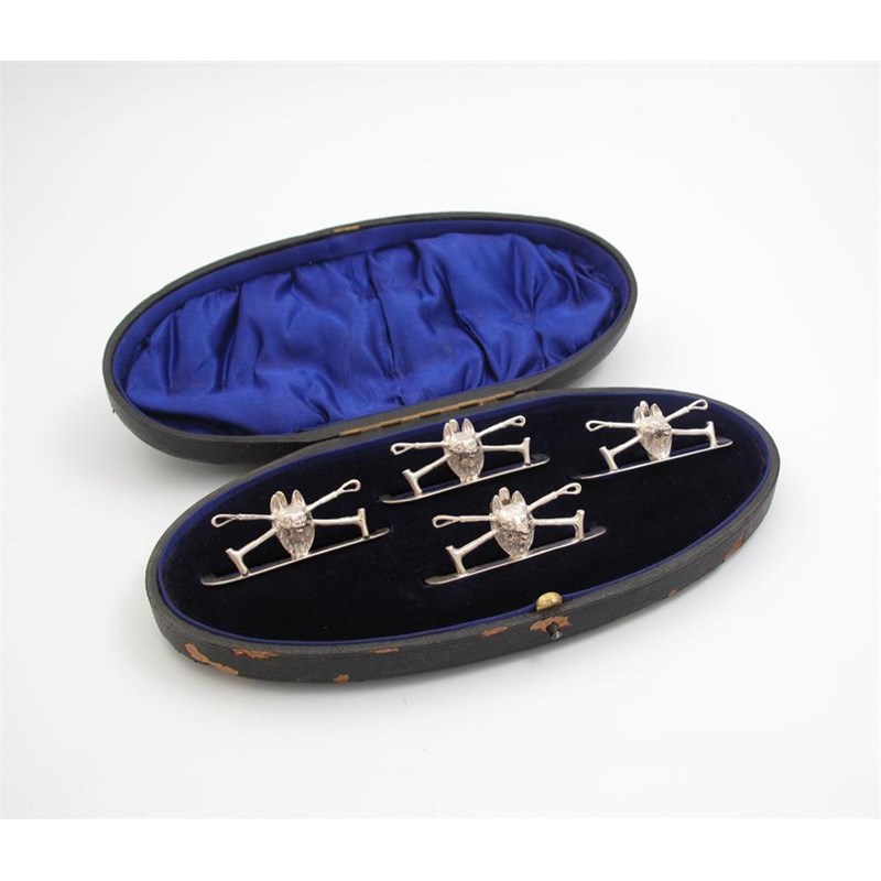 modelled as a fox mask and two crossed hunting whips, on 'D' shaped bases, in a fitted case, length 6.5cm, approx. weight 2oz.