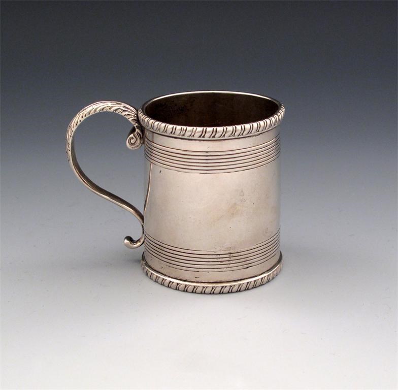 tapering circular form, with an upper and lower reeded girdle, leaf capped scroll handle, height 7.6cm, approx. weight 6oz.