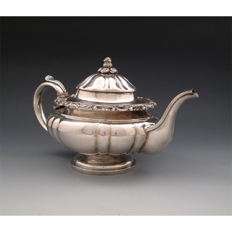 circular lobed form, shell and scroll decoration, fluted capped scroll handle, domed hinged cover, on a circular foot, length handle to spout 30.5cm, approx. weight 30oz.