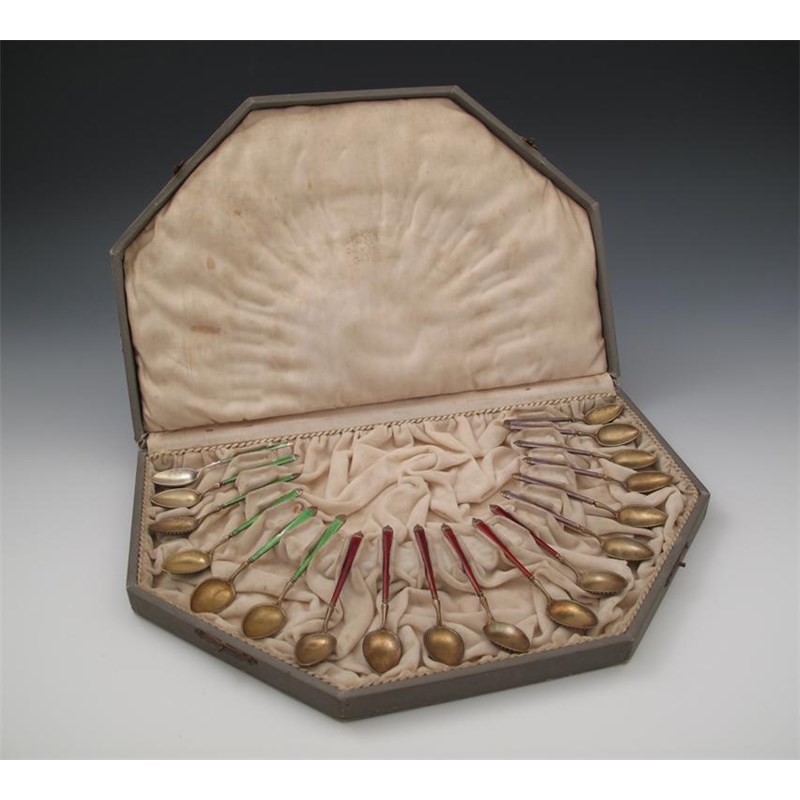each spoon engine turned and enamelled on the stem and reverse in either red, green or mauve,