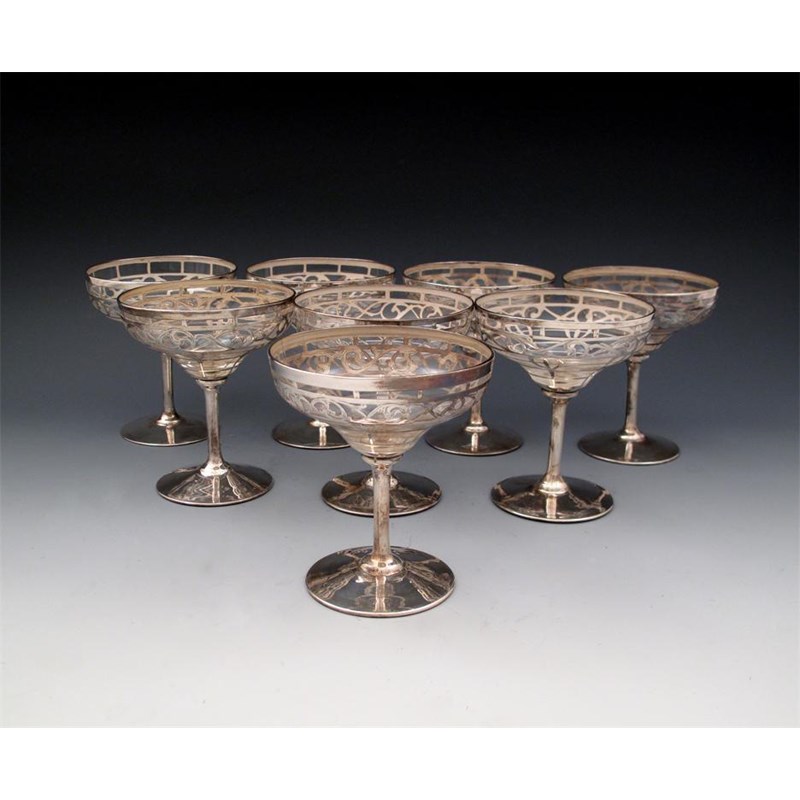 circular form, on raised circular tapering stems, with scroll and linear decoration, height 11.8cm. (8)