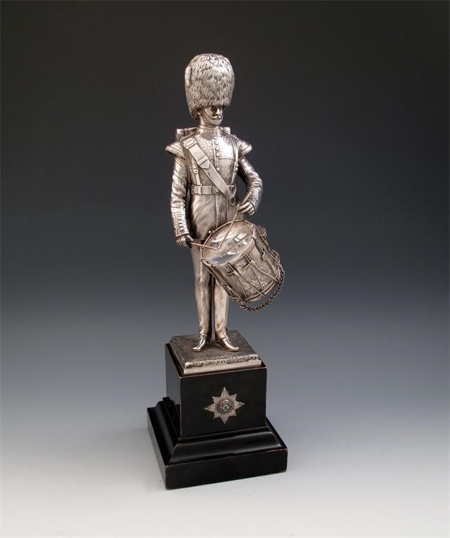 A silver statue of an Irish Guard's drummer