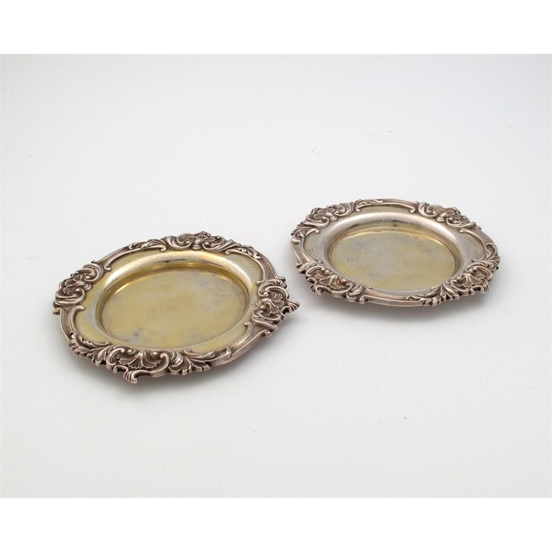 circular form, foliate scroll border, gilded bowls, diameter 12.4cm, approx. weight 7oz. (2)