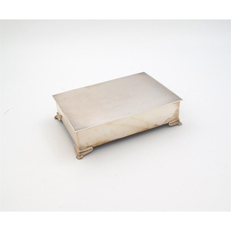 rectangular form, with a solid engine turned hinged cover, wood lining, on four bracket feet, length 16.8cm.