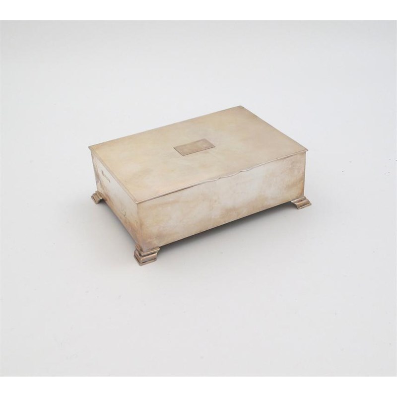 rectangular form, the solid hinged cover with engine turned decoration and a vacant cartouche, the interior with an erased inscription, on four bracket feet, length 14cm.