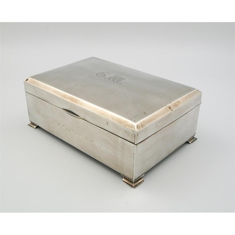 rectangular form, the hinged cover engraved with initials, on four bracket feet, length 23.5cm.