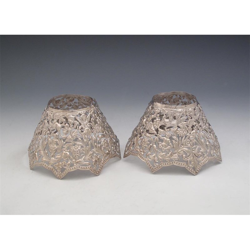 tapering circular form, pierced and embossed foliate scroll and figural decoration, height 7.5cm, approx. weight 2oz. (2)