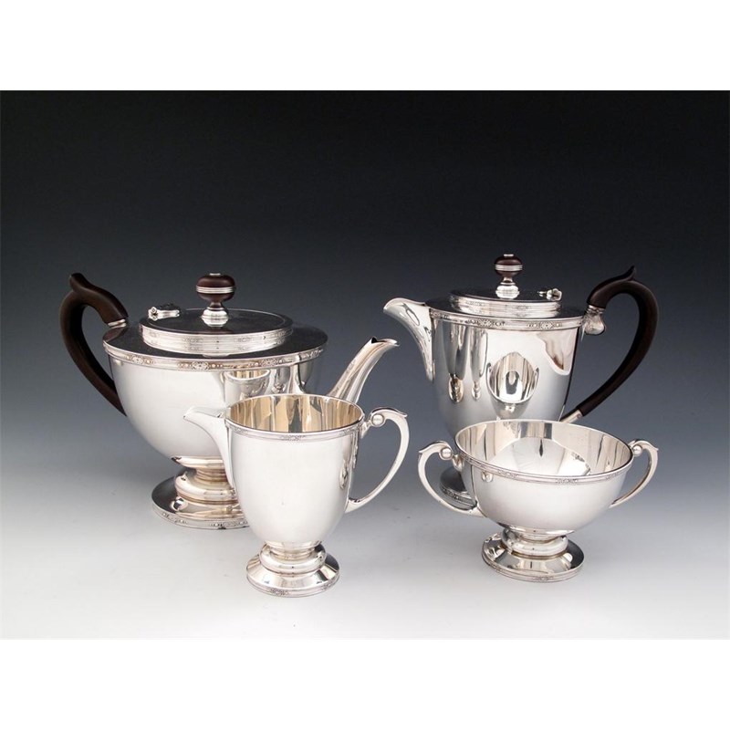 circular tapering form, scroll handles, rosette border, on a raised circular foot, approx. weight 60oz. (4)