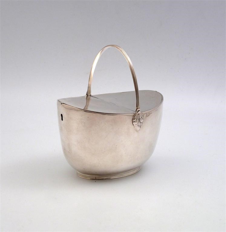 oval form, flush hinged covers, reeded swing handle, with two locks, length 16.5cm, approx. weight 18oz.