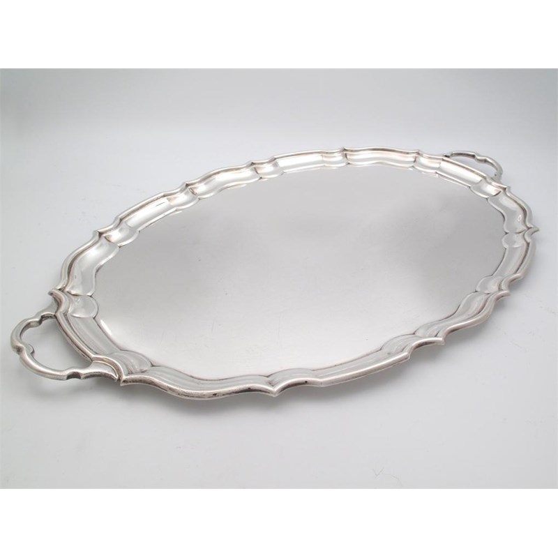 oval form, moulded border, scroll handles, length handle to handle 65cm, approx. weight 80oz.