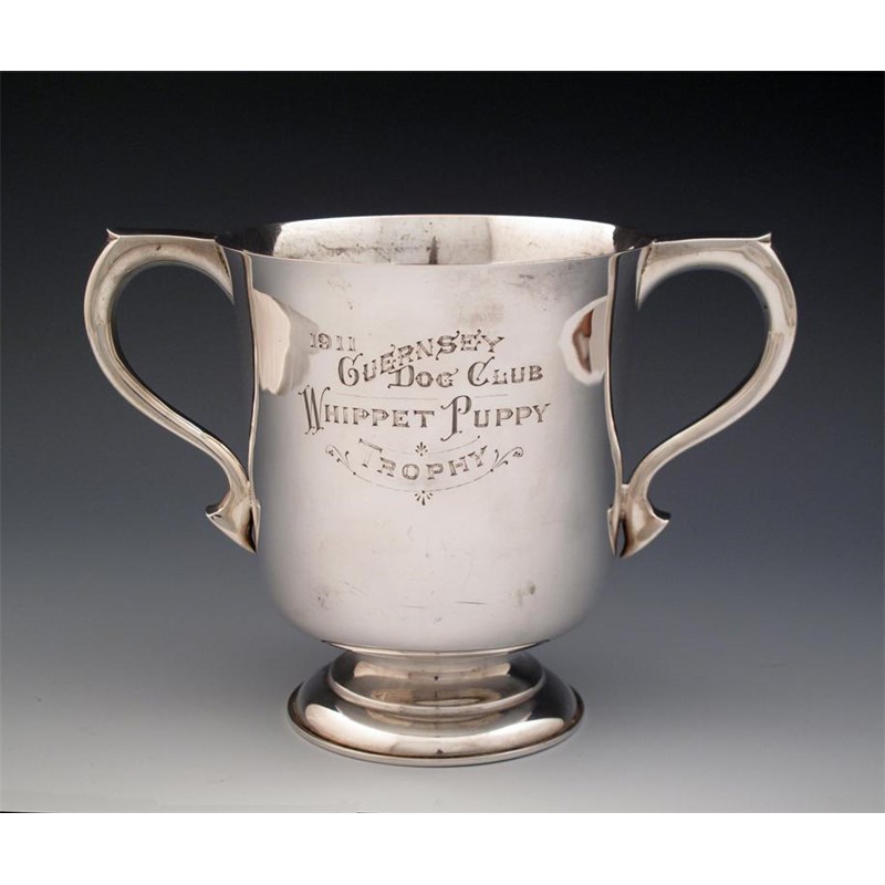 plain circular form, scroll handles, on a raised circular foot, inscribed, ' 1911 Guernsey Dog Club, Whippet Puppy Trophy', height 15.4cm, approx. weight 19oz.