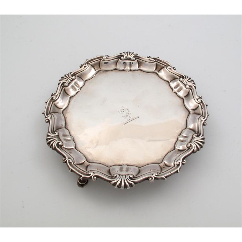 circular form, shell and scroll border, the centre crested, on three hoof feet, diameter 17.8cm, approx. weight 7oz.