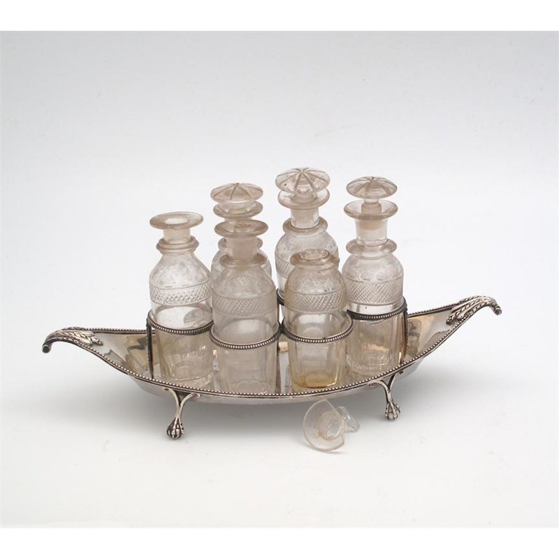 oval navette form, beaded border, wire-work frame, with six cut glass bottles, some damage, length 26.8cm, approx. weight 8oz.