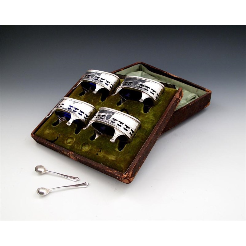 oval form, bright-cut and pierced decoration, blue glass liners, plus two Albany pattern salt spoons, in a fitted case, (case a.f.), length 8.5cm, approx. weight 8oz.