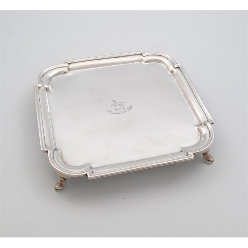 square form, rounded corners, on four bracket feet the centre engraved with a crest and motto, width 21cm, approx. weight 18oz.