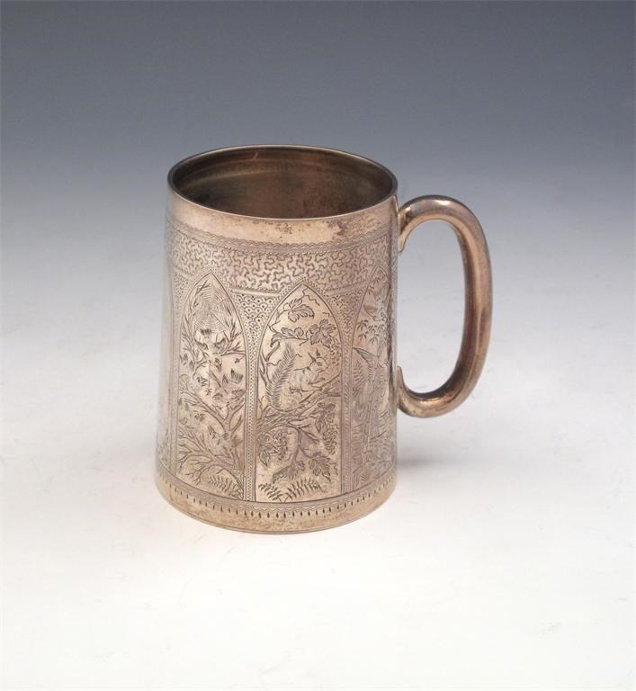 tapering circular form, scroll handle, engraved with birds and animals in Gothic arches, below wriggle work decoration, height 8.8cm, approx. weight 5oz.