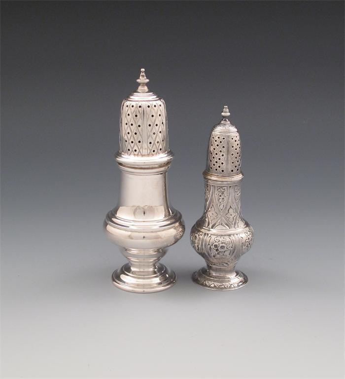 baluster form, pull off cover with a knop finial, on a circular foot, plus a George III silver sugar caster, London 1775, baluster form with later decoration, approx. total weight 8oz. (2)