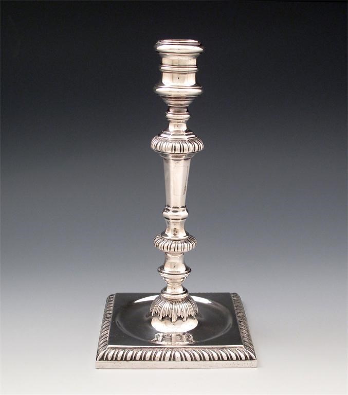 tapering faceted column, gadroon borders, spool shaped capital, on square bases, engraved with an armorial, height 22cm, approx. weight 16oz.