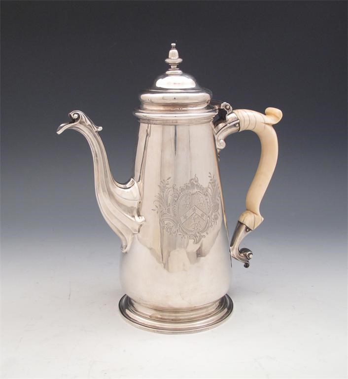 tapering circular form, domed hinged cover with a acorn finial, ivory scroll handle, on a raised circular foot, engraved with two armorials, height 25cm, approx. weight 31oz.