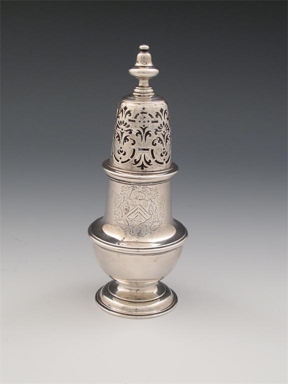 circular bellied form, pull off cover with an acorn finial, on a circular foot, engraved with an armorial, height 16.5cm, approx. weight 7oz.