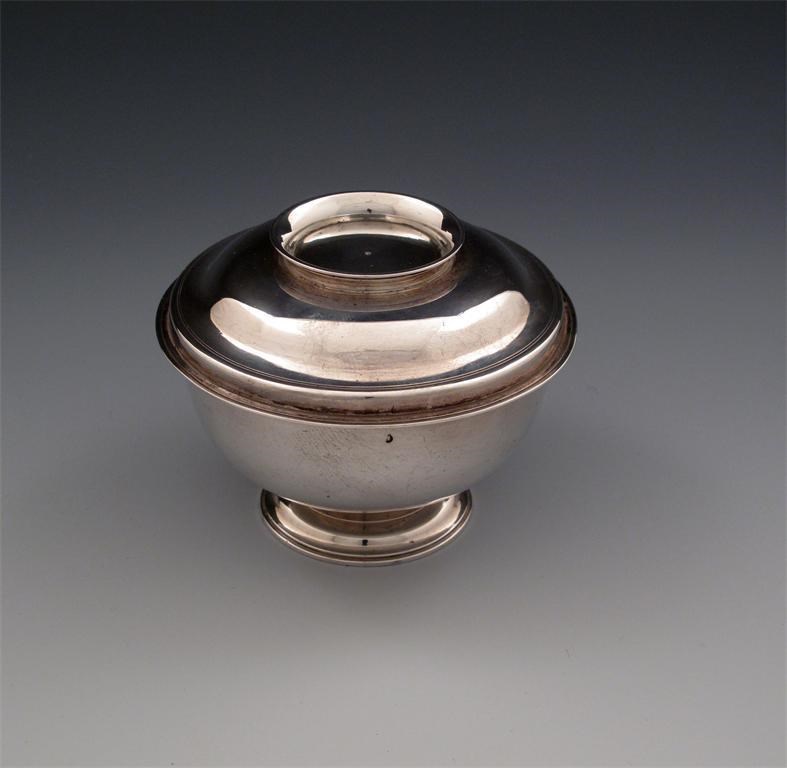 circular form, plain domed pull-off cover, on a raised circular foot, diameter 9.9cm, approx. weight 7oz.