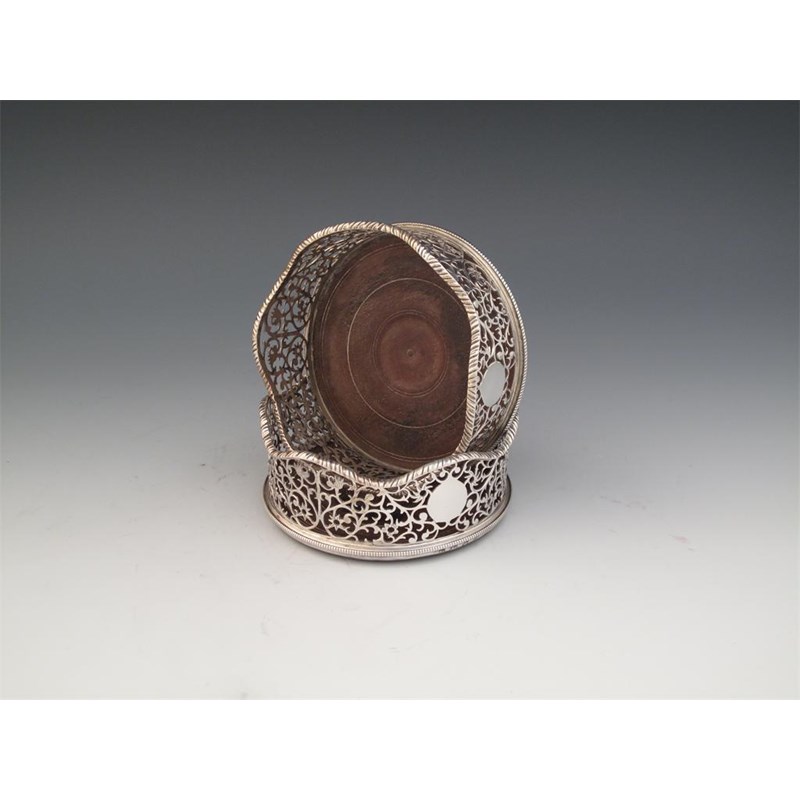 circular form, wavy edge gadroon border, the body pierced with foliate scroll decoration, with vacant cartouches and turned wooden bases, diameter 12cm and 11.8cm. (2)