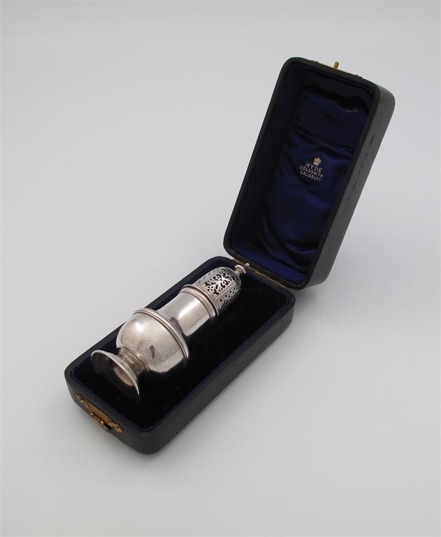 circular bellied form, pull off cover with a knop finial, on a raised circular foot, in a later fitted case, height 12.7cm, approx. weight 2.5oz.