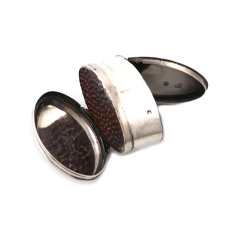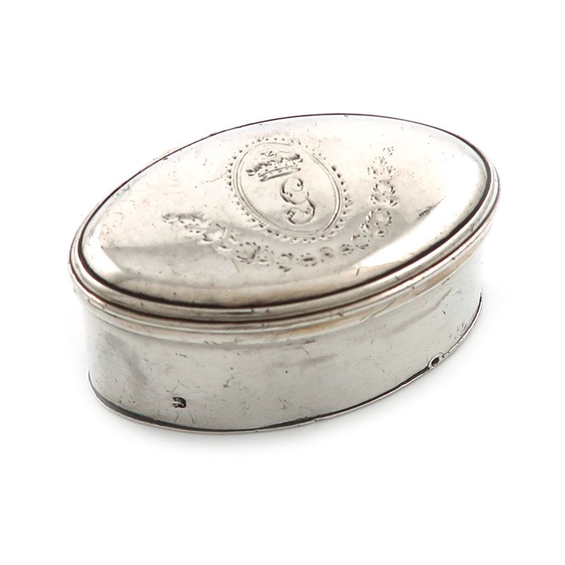 oval form, the hinged cover with a crowned G, and engraved foliate decoration, hinged base, length 5.3cm, approx. weight 1.3oz.
