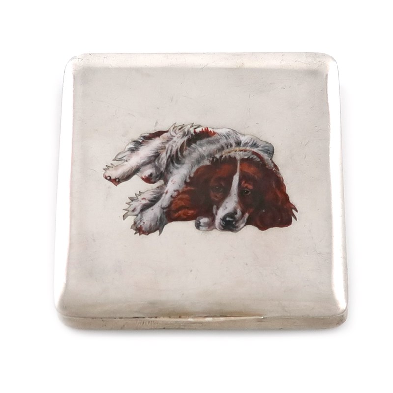 square form, the hinged cover enamelled with lying spaniel dog, length 7.5cm, approx. weight 3.8oz.
