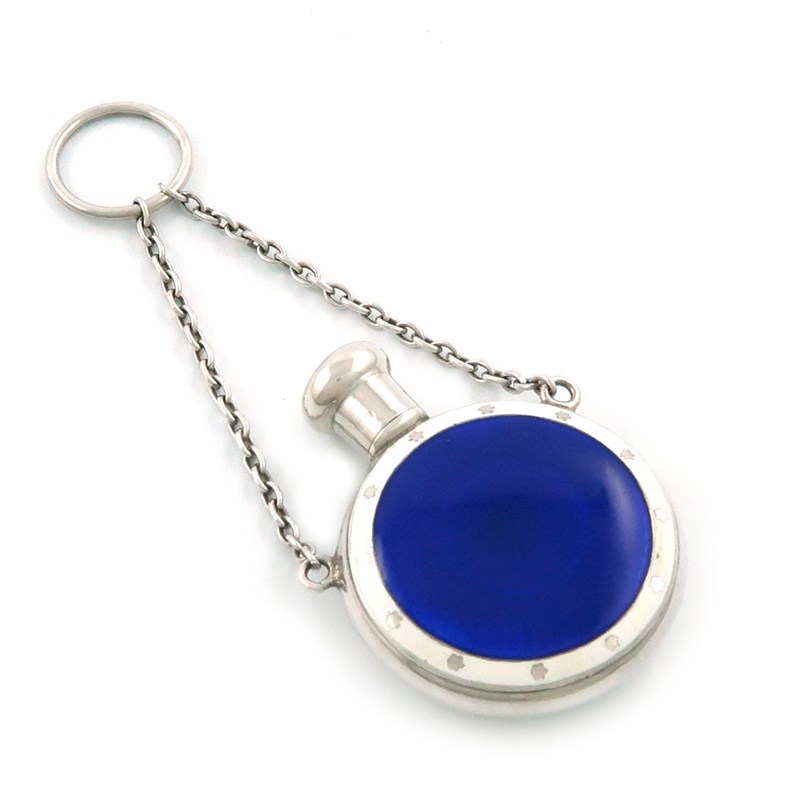 circular form, with dark blue enamel decoration and with a white enamel and star border, screw-off cover, with a chain and ring attachment, diameter 4.3cm, approx. weight 0.8oz.