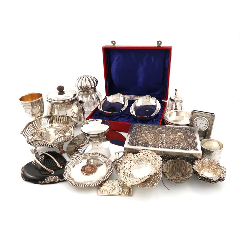 comprising: a Victorian silver-mounted glass inkwell, London 1884, a silver and tortoiseshell wishbone desk clip, London 1899, on a heart-shaped base, a teapot, (lacking handle), a capstan inkwell, a glue pot, a pierced dish, a Kiddish cup, a pair of small dishes, six unmarked circular dishes, a miniature toy of a man on a swing, an ashtray set with a coin, a small modern clock, a set of four small salt cellars and a napkin ring, plus a pair of Pakistani metalware dishes, cased, an Indian/Burmese cigarette box, a medallion and a tea strainer, approx. weighable 24oz. (qty)
