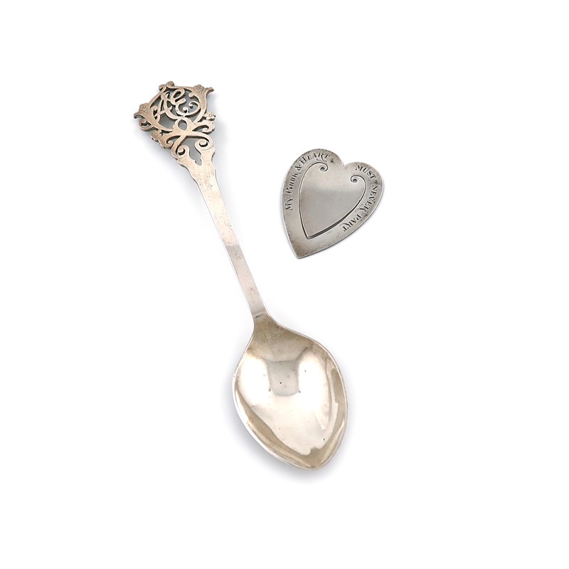 the page marker of heart form, and with Edinburgh marks for 1908, inscribed 'My Book and Heart must never part', length 4.8cm, the spoon with a pierced terminal, and with Edinburgh marks for 1906, approx. weight 1.7oz. (2)