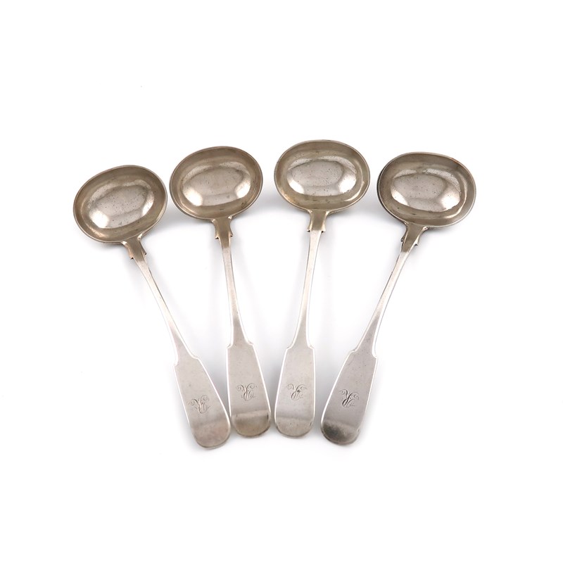 A set of four 19th century Scottish provincial silver Fiddle pattern toddy ladles