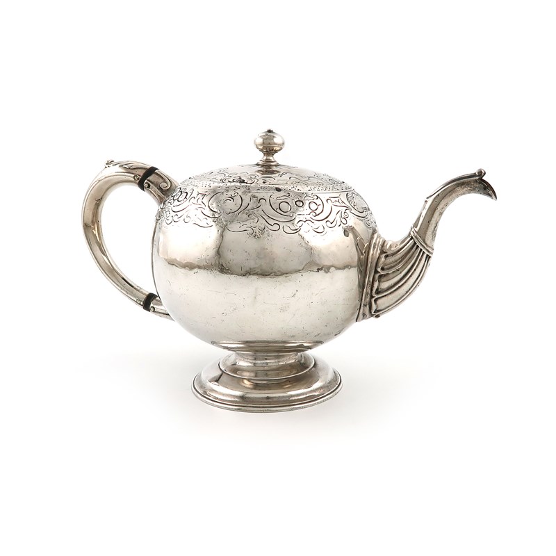 globular form, chased with foliate scroll decoration, the flush-hinged cover with a knop finial, the leaf capped scroll handles with wooden insulators, on a raised circular foot, the underside of the foot initialled 'JC', length handle to spout 24.5cm, approx. weight 22oz.