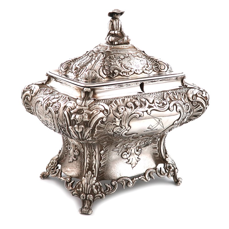 rectangular bombé form, embossed with pagodas and foliate and shell decoration on a matted background, with a lock, the hinged cover with a finial modelled as a seated Chinaman, on four foliate scroll bracket feet, with a pierced foliate scroll apron, engraved with a crest, the interior of the base with a fitting to hold a divider, height 19cm, approx. weight 29.3oz.